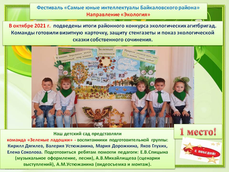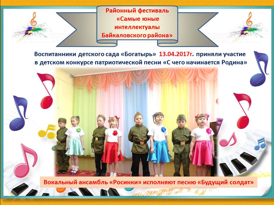 Команда "Богатырь" заняла первое место в летней олимпиаде дошкольников с. Байкалово, проводимой в рамках районного фестиваля "Самые юные интеллектуалы Байкаловского района". 10.04.2012г. Руководитель Евтюгина Галина Борисовна.